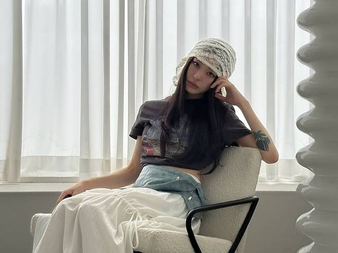 특히 눈에 띄는 건 머리를 감싸는 레이스 소재의 화이트 비니다. 우아하면서도 몽환적인 감성을 더하며 전체적인 스타일에 여름 햇살 같은 포인트를 준다. 팔에는 선명한 타투가 노출돼 노제 특유의 자유로운 감성을 더한다.