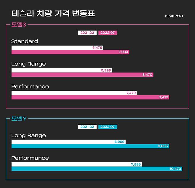 지난 15일, 테슬라코리아는 모델3 롱레인지와 모델Y 롱레인지ㆍ퍼포먼스 트림의 가격 인상을 단행했다. 인상 후 판매가는 모델3 롱레인지가 8497만원 모델Y 롱레인지 9665만원, 퍼포먼스 1억473만원 등이다. 이는 앞서 지난달보다 모델3 기준 145만원, 모델Y는 179~277만원이 높아졌다.