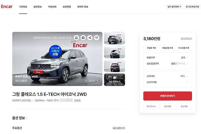 국내 최대 중고차 플랫폼 엔카닷컴에 따르면 2025년형 그랑 콜레오스 하이브리드 아이코닉 매물이 3,180만 원에 판매되고 있다. 해당 사양의 신차 가격은 4,152만 원. 누적 주행 거리가 8,815km로 아직 네 자릿수이며, 사고 이력이 없음에도 972만 원으로 천만 원에 가까운 감가가 적용된 것이다.