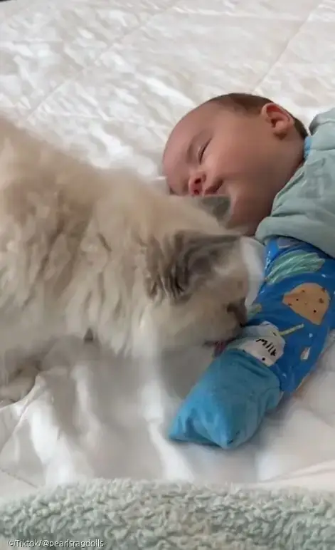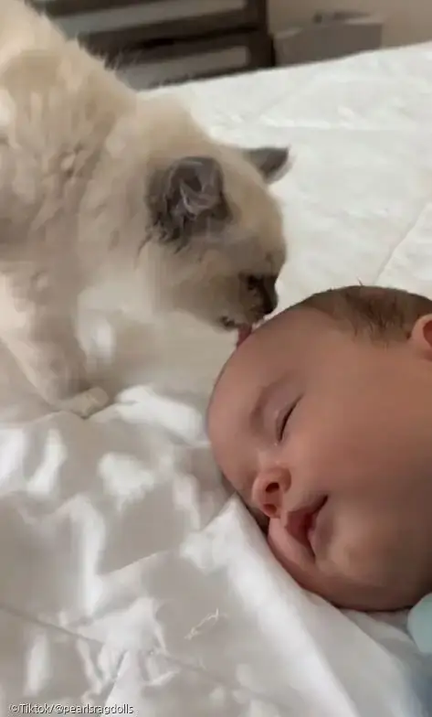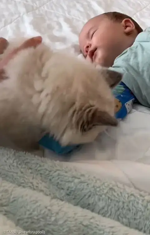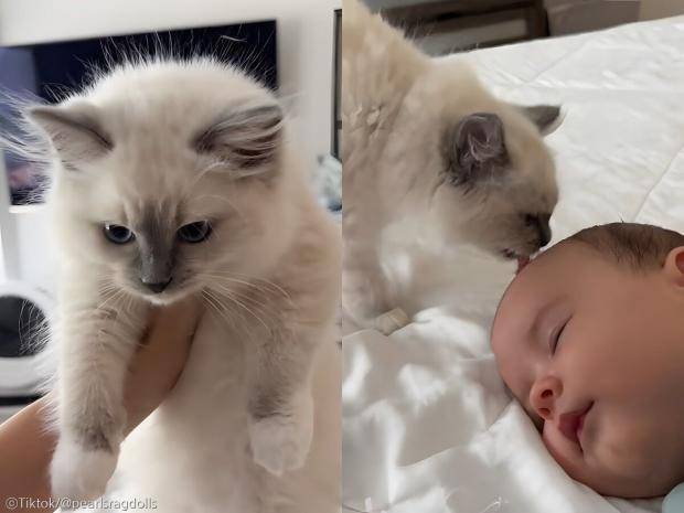 갓난 아기한테 귀엽게 집착하는 새끼 고양이가 사람들의 눈길을 사로잡았습니다.