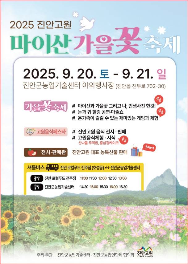 오는 9월 20일(토)부터 21일(일)까지, 진안군농업기술센터 야외행사장에서는 ‘2025년 진안고원 마이산 가을꽃 축제’가 개최됩니다. 마이산을 배경으로 끝없이 펼쳐진 코스모스 물결은 가을 여행자들에게 더할 나위 없는 선물이 되어줄 거예요.