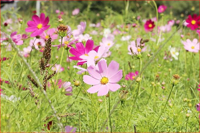 진안군농업기술센터 실증 시험포장에는 이미 코스모스가 만개해 가을 풍경을 완성하고 있습니다. 지난해 심었던 코스모스가 저절로 씨앗을 퍼트려 올해도 자연스레 꽃을 피워냈다고 하니, 더욱 특별한 의미가 있지요.