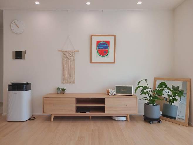 저희 집은 TV가 없는 거실이에요. 그래서 거실 벽에는 예쁜 그림과 마크라메 월 행잉 그리고 스피커를 뒀어요.