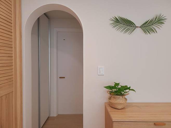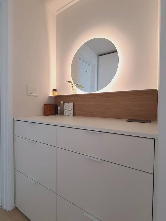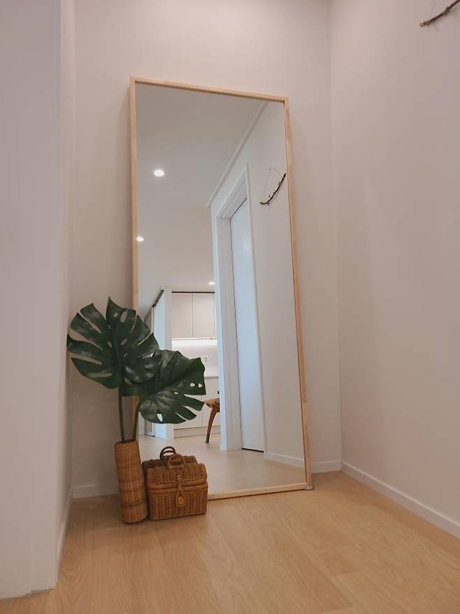 여기는 수납장을 짜 넣거나 액자를 걸거나 하는 방식의 인테리어 사례가 많았는데 저는 전신거울을 놓아서 포토존으로 활용해 보았어요^^
