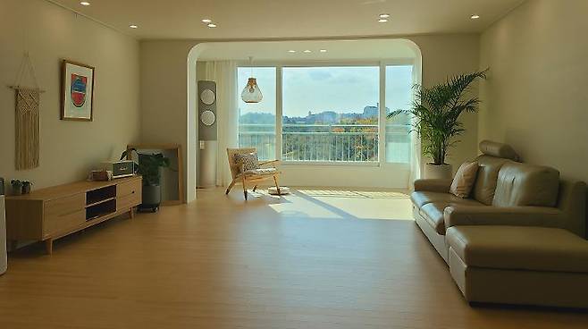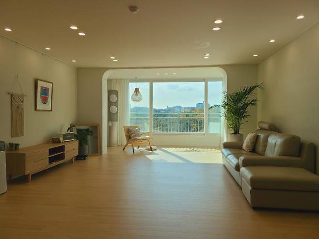 추천하고 싶은 가구는 확장된 거실에 놓인 라운지 의자예요. 넓은 베란다를 확장한 만큼 확보된 거실 공간에서 통창으로 숲 뷰를 감상할 수 있거든요.