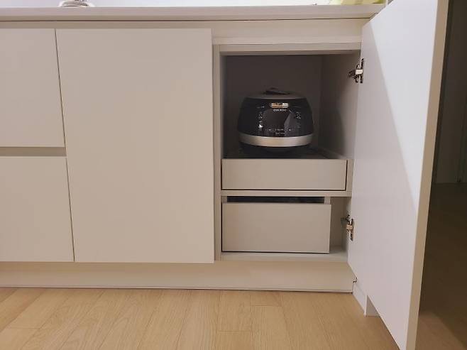 전기밥솥의 경우 하부장에 쏙 숨어있어서 싱크대 상판에 가전이 올라가 있지 않아요. 제가 좀 부지런을 떨어야 하긴 하지만 그래도 깨끗한 주방을 유지할 수 있다면 감수해야죠 ㅎㅎ