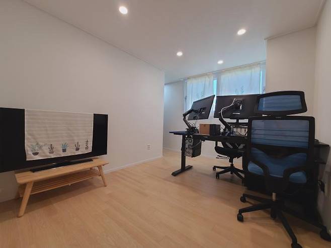 책상의 앞뒤로 의자를 둬서 남편과 저가 각자 작업을 할 수 있도록 배치했고요~