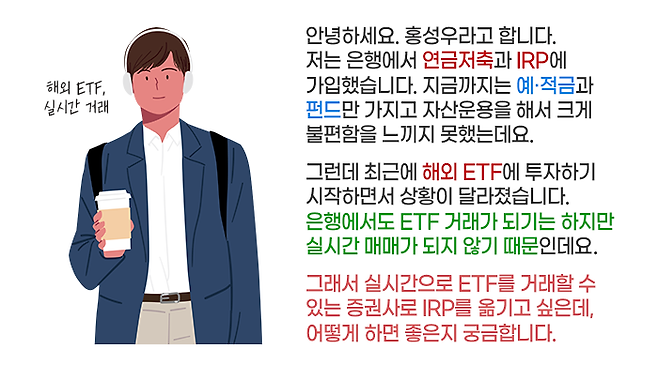 사람마다 처한 상황이 다른 만큼 연금이체를 하려는 경우도 제각기 다양합니다. 더 높은 수익을 찾아 떠나는 사람도 있는가 하면, 여기저기 흩어진 연금을 한곳에 모아서 연금을 받으려는 사람도 있습니다. 홍성우 씨처럼 ETF와 리츠 등 투자상품을 위해 금융회사를 옮기는 사람도 있죠.