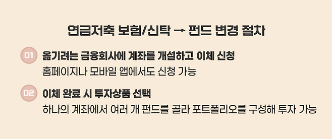 옮기려는 금융회사에 계좌를 개설하고 이체 신청을 하면 됩니다. 금융회사를 직접 방문하지 않고 홈페이지나 모바일 앱에서도 이체 신청을 할 수 있습니다. 이체가 완료됐으면 투자상품을 선택해야 합니다. 연금저축펀드 가입자는 하나의 계좌에서 여러 개의 펀드를 골라 포트폴리오를 구성해 투자할 수 있습니다.