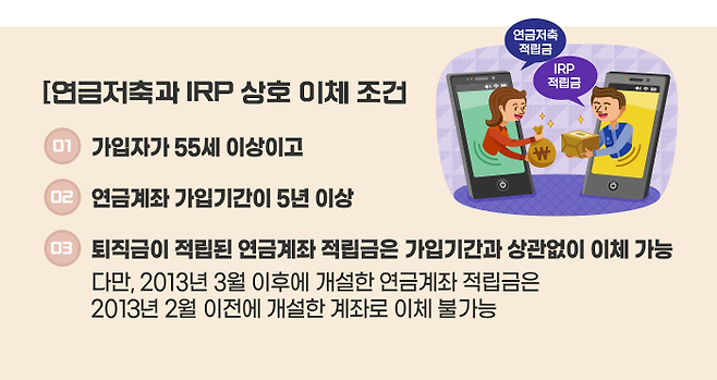 은퇴를 앞두고 여기저기 흩어져 있는 연금저축과 IRP를 한곳으로 모아 연금을 수령하려는 사람도 있습니다. 이렇게 연금저축과 IRP 상호간 이체를 하려면, 가입자가 55세 이상이고 연금계좌 가입기간이 5년이 넘어야 합니다.