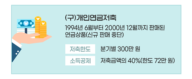(구)개인연금저축은 1994년 6월부터 2000년 12월까지 판매된 연금상품입니다. 2001년에 연금저축이 도입되면서 신규 판매가 중단되기는 했지만, 기존가입자는 계속 저축하면서 소득공제 혜택을 누릴 수 있습니다.