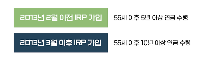 이는 연금수령요건과 관련이 있는데요. 2013년 2월 이전에 가입한 IRP는 55세 이후에 5년 이상 연금을 수령하면 됐지만, 2013년 3월 이후에 가입한 IRP에는 55세 이후에 10년간 연금을 수령하도록 하고 있습니다.