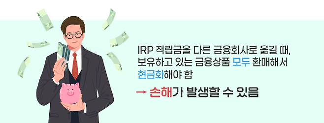 IRP 적립금을 다른 금융회사로 옮길 때는, 보유하고 있는 금융상품을 모두 환매해서 현금화해야 하기 때문에 손해가 발생할 수 있습니다.