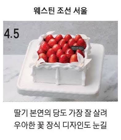 웨스틴 조선 서울의 조선델리 '딸기 케이크'는 평균 4.5점을 받았다. 딸기 본연의 당도를 가장 잘 살렸다는 평가를 받았다. 이 기자는 "인공적인 단맛 없이 자연스러운 단맛이 돋보이며, 촘촘하게 채워진 딸기 슬라이스의 완성도가 높다"면서 4.7점의 높은 점수를 줬다. 권 기자는 "첫맛의 직관적인 단맛을 지나면 진한 딸기 향이 쏟아져 들어온다"고 전했다. 선물박스를 형상화한 우아한 꽃장식은 선물용으로 제격이다. 박윤균 기자는 "꽃 모양의 설탕공예로 이뤄진 고급스러운 디자인이 인상 깊었다"고 평가했다. 박윤예 기자는 "속에 들어간 빵과 생크림, 딸기의 비율이 적절하다"고 평했으나 "맛이 평범하고 크기가 다른 제품에 비해 작아 가성비 면에서는 아쉽다"는 의견을 냈다.