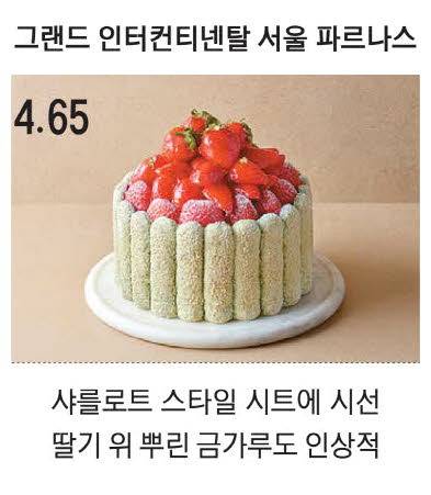 2위 자리는 평균 4.65점을 받은 그랜드 인터컨티넨탈 서울 파르나스의 '딸기 생크림 케이크'가 가져갔다. 파르나스는 전형적인 시트 대신 '레이디 핑거 비스킷'으로 가장자리를 감싼 샤를로트 스타일로 신선함을 더했다. 개인 최고점인 4.8점을 준 이 기자는 "비주얼 완성도가 매우 높아 첫인상이 강렬하다"면서 "내부에 딸기 슬라이스가 가장 풍부하게 들어가 있으며, 당도는 과하지도 가볍지도 않은 중간 수준으로 안정적"이라고 평가했다. 이어 이 기자는 "외부를 감싸는 초록색 시트와 내부의 흰 시트는 질감과 맛이 서로 달라 입체적인 식감"이라고 강조했다. 박윤예 기자는 "딸기 위에 금가루를 얹어 비주얼이 뛰어나고 보는 재미와 먹는 재미가 모두 있다"고 덧붙였다. 하지만 "자를 때 딸기가 쏟아져 나와 다소 먹기 불편하다"는 현실적인 지적도 있었다.