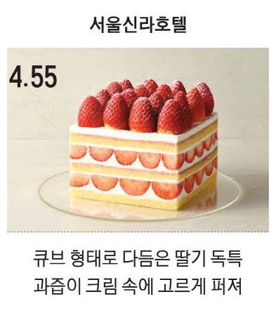 그다음은 서울신라호텔 '딸기 쇼트 케이크'가 평균 4.55점을 받았다. 호텔신라는 화려한 장식 대신 '정갈함'과 '균형'에 집중한 케이크를 선보였다. 셰프들이 직접 선별한 당도 11브릭스 이상의 금실딸기를 큐브 형태로 다듬어 넣은 것이 특징이다. 권 기자는 "딸기를 섬세하게 다듬어 넣은 덕분에 한입 베어 물 때마다 과즙이 크림 속에 고르게 퍼진다"며 갓 짜낸 원유 같은 크림 풍미를 높게 샀다. 이 기자는 "크림의 묵직함이 네 곳 중 중간 수준으로 가장 안정적이며, 딸기 슬라이스 크기가 시트와 먹기에 가장 적절하다"고 분석했다. 박윤균 기자는 "크림 단맛이 과하지 않고 전체적인 밸런스가 잘 잡혀 있다"고 평했다. 다만 박윤예 기자는 "맛이 전반적으로 안정적이지만 브랜드 명성에 비해 임팩트가 없어 다소 무난하다"며 아쉬움을 표했다.