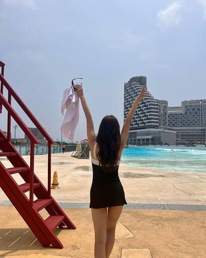 특히 붉은색 구조물과 수영장의 푸른빛이 대비를 이루며, 그녀의 모던한 스타일링을 더욱 돋보이게 했다. 댓글에는 “화보 그 자체”, “원피스 하나로 분위기 끝판왕” 등의 반응이 이어졌다.