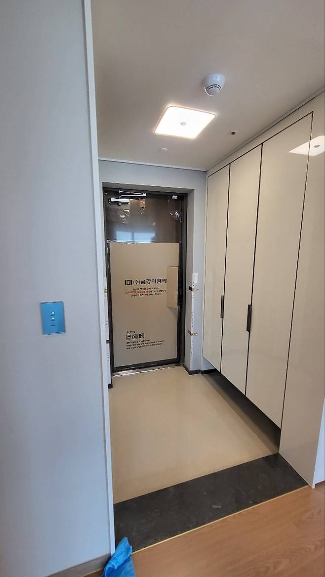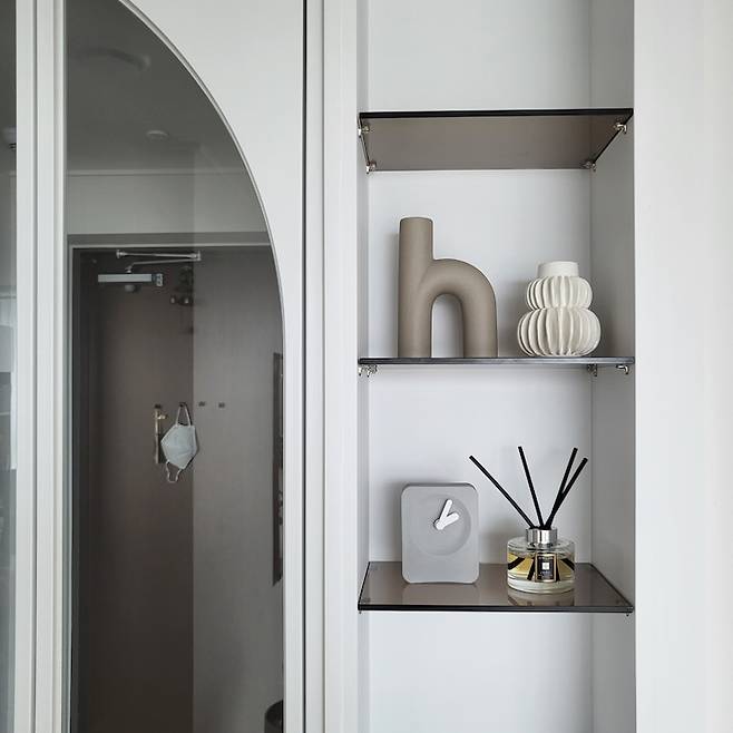 골라 놓은 아치형 중문디자인이 있어 인테리어 업체에서 스윙도어 형태로 그대로 제작해주셨습니다. 현관 타일과 검정색 디딤석을 그레이 색상의 무광 타일로 통일하여 깔끔하게 시공해주었고, 위쪽 다운라이트 조명과 신발장 하부 간접 조명을 센서등으로 사용하고 있습니다.