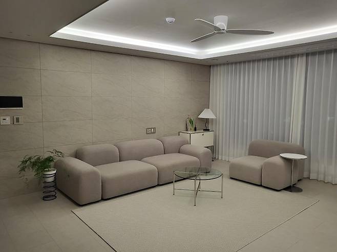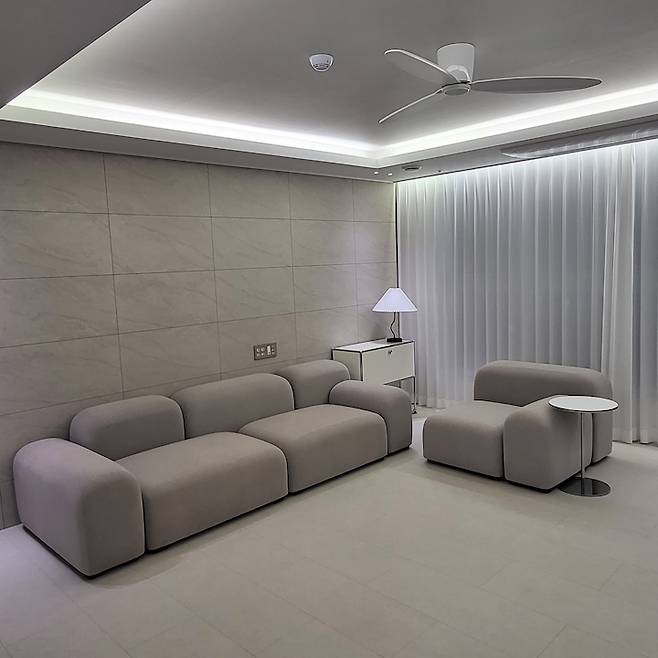 조명은 전체적으로 간접 조명을 바탕으로 다운라이트 조명으로 부분적인 조명 포인트를 주었고, 기존 우물 천장 가운데에 실링팬을 설치하였어요. 설치에 고민을 많이 하다 결정하였는데 저와 같은 고민을 하는 분들에게 감히 200% 만족하실 거라고 추천 드리고 싶어요.