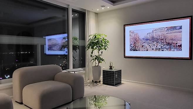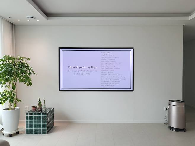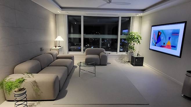거실에는 TV를 쏙 매립할 수 있는 가벽을 세워 깔끔하게 연출했습니다. 가벽을 세우면서 양쪽에 융 콘센트도 추가로 넣어서 유용하게 사용하고 있습니다. TV를 갤러리 모드로 틀어 놓으면 마치 벽에 액자를 걸어 놓은 것처럼 보여 더 만족스러워요.