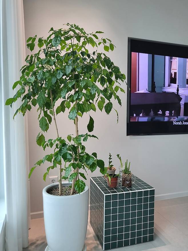 이 해피트리 화분은 첫 결혼기념일에 남편 회사에서 선물 받은 나무인데, 8년째 무럭무럭 잘 자라주고 있는 (이제는 자식 같은?) 반려 식물이랍니다. 중간에 위험한 고비도 있었지만, 분갈이와 가지치기 후에 더욱 더 풍성하게 잎을 내주고 옆에 작은 아기줄기도 새로 올라와서 더욱 애정을 듬뿍 주고 있어요 ^^