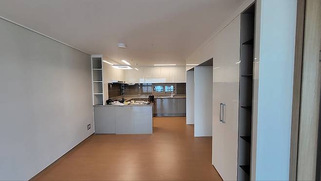 기존 주방은 상하부장이 색상이 다른 데다 유광이어서 올 화이트 무광으로 필름작업을 진행하였어요. 칸칸이 나눠진 장식장이 있었는데 문을 달아 안 보이게 하였고, 냉장고장 좌우 부분에는 다른 기타 전자제품을 모두 수납할 수 있는 공간으로 사용하게끔 새로 장을 짜는 작업을 했습니다.