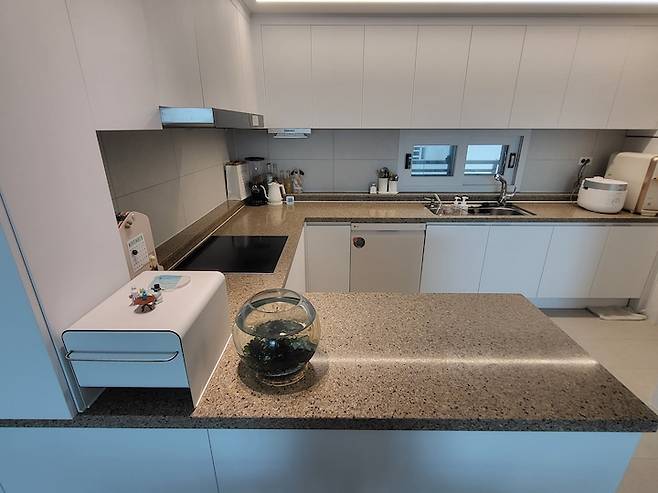 ㄷ자 형태의 주방입니다. 상, 하부장과 아일랜드 수납장까지 수납 공간이 정말 많죠? 그래서 최대한 물건은 수납장에 넣어두고 깔끔한 주방을 유지하려고 노력해요. 아일랜드 위에 놓은 화이트 철제 슬라이딩 수납장은 손이 자주 가는 영양제와 물고기 먹이 등을 수납하고 있는데 정말 편하게 사용하고 있어서 강추입니다.