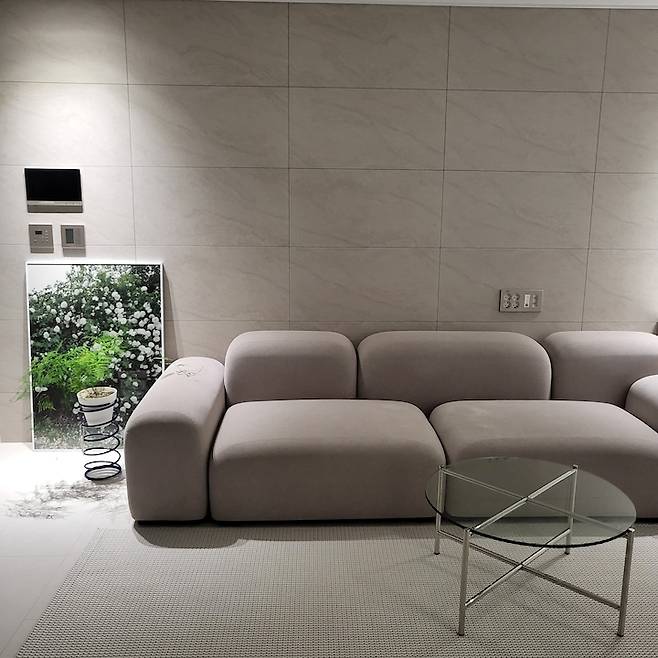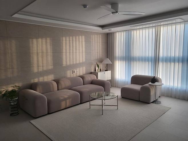 이사 오기 전에 검정색 가죽 소파를 오랫동안 사용하여서 이번엔 밝은 색의 패브릭 소파로 바꾸길 원했고, 착석감이 하드하지만 그만큼 아이들이 혹여나 뛰더라도 덜 꺼질 것 같았어요. 그리고 기능성 패브릭이라 사용하면서 아이들이 아이스크림이나 초코를 묻혀도 물티슈로 닦으면 말끔히 지워져요. 낮은 등받이로 인해 공간이 더 넓어 보이는 효과도 주는 듯 합니다. 무엇보다 저 동글동글함이 너무 사랑스럽지 않나요?