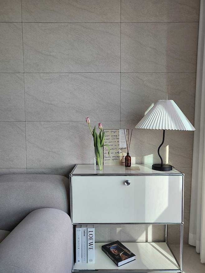 수납장 위에는 플리츠 라인이 세련된 스탠드 조명과 포스터, 디퓨저, 화병으로 꾸며주었어요. 집에 새로운 꽃을 들일 때면 항상 포토존으로 이용되는 곳이랍니다. (사진에 보이는 꽃은 스타튤립입니다♥)