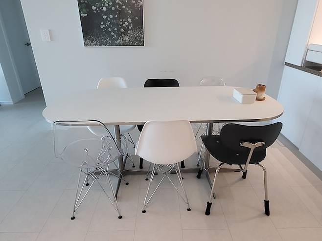 테이블은 플랜트란스에서 FENIX소재의 1800 사이즈, 의자는 수많은 레퍼런스 수집 끝에 투명/화이트/블랙 조합을 선택했는데 아주 마음에 들어요. 화이트 인테리어나 모던 미드센추리 인테리어에 무채색 계열이 가장 무난하면서도 심플한 듯 합니다. 역시 심플 이즈 더 베스트!