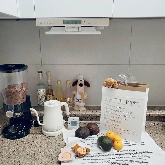 외관상 심플하게 손잡이나 홈 없이 모두 누르면 열리는 방식으로 했고, 냉장고 왼쪽 수납장에는 에어 프라이기, 믹서기, 커피 머신, 토스트기, 멀티 오븐을 넣어주었고, 하부에는 간식이나 부식 등을 넣어두고 있어요.