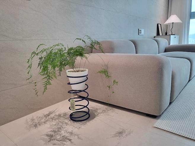 소파 옆 컬러감 있는 독특한 화분은 Naturallynatural에서 구입한 아스파라거스나누스입니다. 하늘하늘하게 뻗어내리는 쉐잎이 우아해요ㅎㅎ 키우기도 쉽고 성장 속도도 빠른 편이라 새순이 돋아나서 쭉쭉 뻗어나가는 게 눈에 바로 보인답니다.