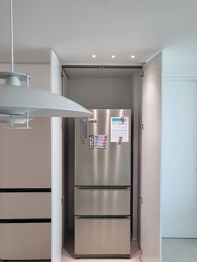 냉장고 오른쪽 수납장에는 기존에 사용하고 있던 또 하나의 김치 냉장고가 감쪽같이 들어가 있답니다.