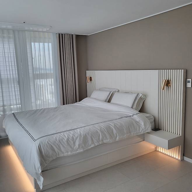 침실은 저희 집에서 유일하게 진베이지 색상의 벽지로 다른 가구 없이 침대만 심플하게 두었습니다. 호텔 같은 느낌으로 꾸미고 싶어 천장 가운데 있던 메인 조명을 제거하고 커튼 박스에 간접 조명으로 은은한 분위기가 나도록 조명 공사를 했고, 침대는 양 사이드에 협탁과 조명, 콘센트가 있는 침대를 골랐어요. 침대 하단에 라인 조명이 들어가 있어 따로 조명을 켜지 않아도 침대 조명만으로 아늑한 분위기를 낼 수 있습니다.