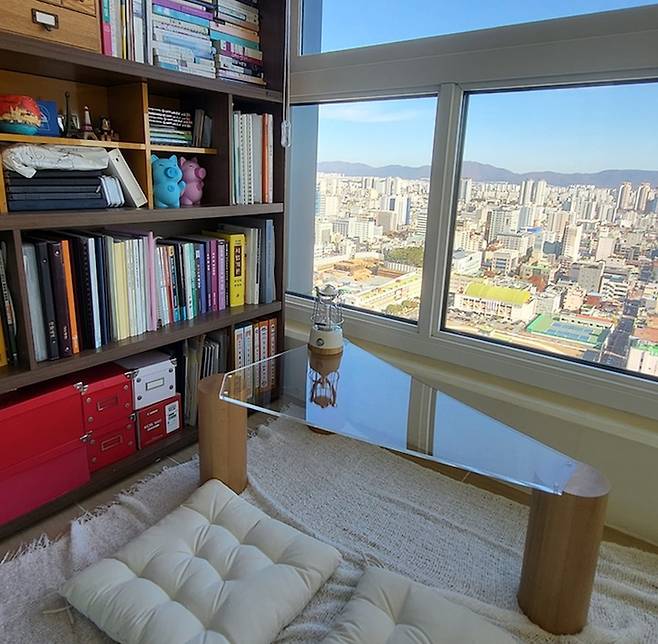 책이 가득한 책장을 놓고 티 테이블을 두었어요. 밤에 이 공간에서 야경을 보면서 차 한잔과 함께 진공관 스피커로 음악 감상을 하는 그 시간이 저희에겐 정말 힐링되는 시간입니다 :)