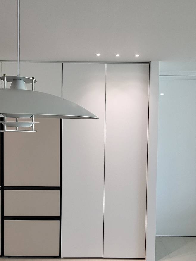 ㄷ자로 제법 넓게 빠진 주방입니다. 마치 틀린 그림 찾기 같은 전후 사진이죠? 주방 조명은 얇은 라인 조명으로 채도를 높여 좀 더 화사하고 깔끔한 분위기를 연출했고 식탁 위 행잉 조명(주말의 오전에서 구매한 아르텍JL341)으로 포인트를 주었습니다.