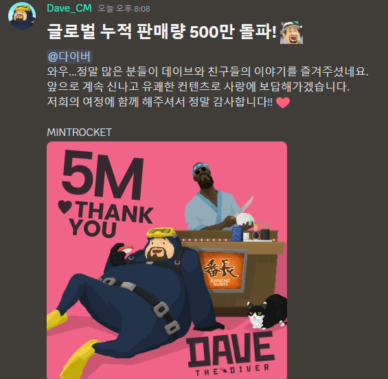 넥슨의 자회사 민트로켓이 개발한 해양 어드벤처 및 경영 시뮬레이션 게임 '데이브 더 다이버'가 글로벌 판매량 500만 장을 달성하며 한국 게임 산업에 또 하나의 이정표를 세웠다.