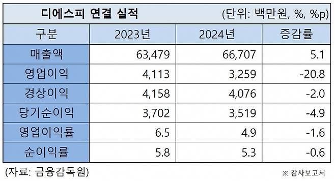 디에스피는 지난해 경영 실적으로 매출액 667억 700만 원을 달성했다. 전년 동기 대비 5.1% 증가했다. 특히 수출 매출액이 83억 4,800만 원 수준에 달해 전년보다 약 10% 증가했다. 비교적 규모가 작은 상품 매출액이 전년보다 약 6,000만 원 줄어든 2억 4,000만 원을 기록했지만, 가장 규모가 큰 제품 매출액이 581억 1,800만 원으로 전년보다 4.6% 증가한 영향도 반영됐다.