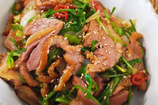 부추는 오리고기와 함께 섭취했을 때 서로의 영양을 보완해 주는 궁합이 좋은 음식으로 전해진다. 부추의 따뜻한 기운이 찬 성질을 가진 오리고기의 성질을 중화시켜 함께 먹었을 때 균형을 이루기 때문이다. 또한 부추는 오리 특유의 냄새를 잡아주는 데에 효과적이다. 이는 많은 식당에서 오리고기를 부추무침과 함께 제공하는 이유다.