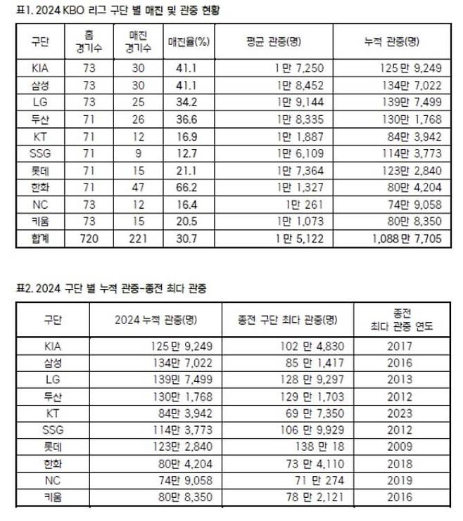한국야구위원회(KBO)는 2일 '2024 신한 SOL 뱅크 KBO 리그'가 총 1088만7705명의 총관중으로 정규 시즌을 마무리했다고 밝혔다. 2017년 840만688명을 훌쩍 넘은 역대 한 시즌 최다 관중으로 671경기 만에 1000만 관중을 돌파했고, 여세를 몰아 109만 명에 육박했다.