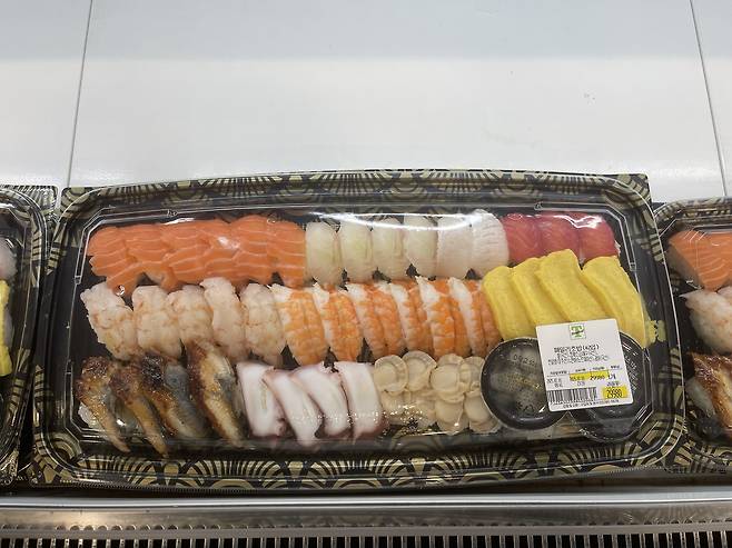 생연어와 광어를 포함한 9가지 재료로 구성된 초밥 42입으로 온 가족이 함께 다양한 종류를 즐길 수 있는 푸짐한 초밥 세트에요.