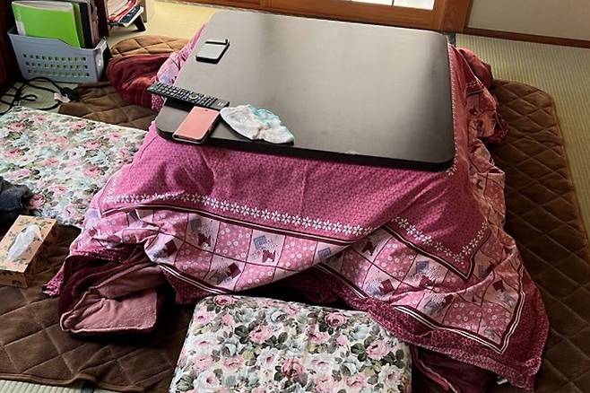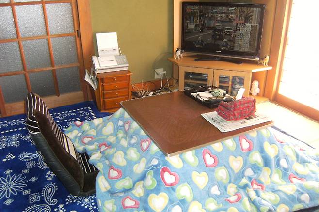 코타츠는 일본의 대표적인 난방기구로 윗판과 다리가 따로입니다. 다리 부분에 담요를 덮고 그 위에 상판을 덮어 사용하는데요.