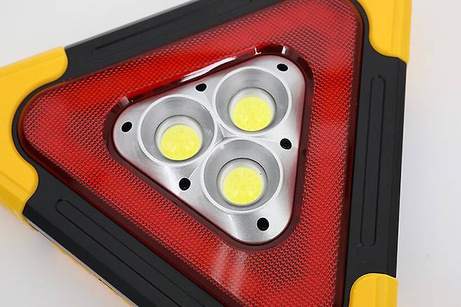 붉은색 삼각형 안쪽에는 직경 약 25㎜가량으로 굉장히 큼직한 COB LED 세 개가 삼각형 모양으로 삽입되어 있다.