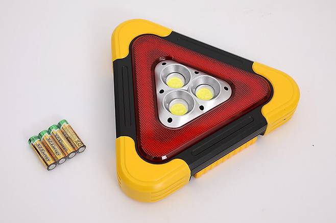 구성품으로는 LED 안전삼각대 본체와 AA 배터리 4개만 들어 있다. 사용 설명서의 부재가 궁금할 수 있겠지만, 사용법이 워낙 간단한 데다가 설명이 박스 뒷면에 인쇄되어 있기 때문에 딱히 별도의 설명서를 필요로 하지는 않는다.
