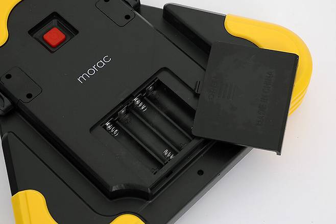 버튼 아래쪽에 있는 네모난 커버를 열어보면 배터리를 넣는 공간이 나타난다. 배터리는 앞서 구성품에서 본 것과 마찬가지로 AA타입 4개를 사용한다.