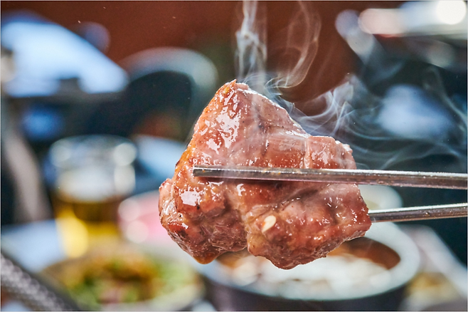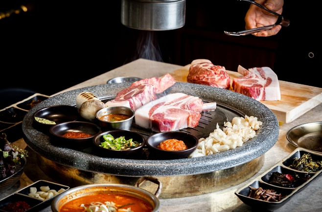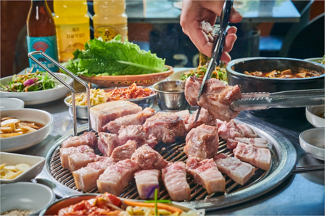 삼겹살, 목살, 항정살, 앞다릿살 등 다양한 부위를 제공하며, 모든 고기는 직원이 직접 구워주는 방식으로 진행돼요. 이곳에선 굽기의 타이밍과 순서조차 하나의 완성된 코스처럼 느껴지죠. 특히 바삭하게 익힌 겉면과 속에 남은 촉촉한 육즙이 조화를 이뤄 감탄이 절로 나옵니다.