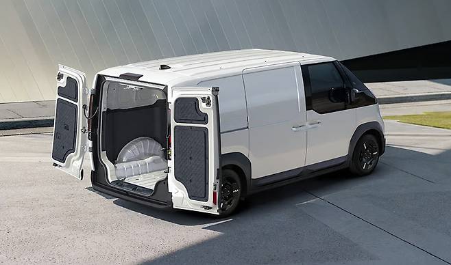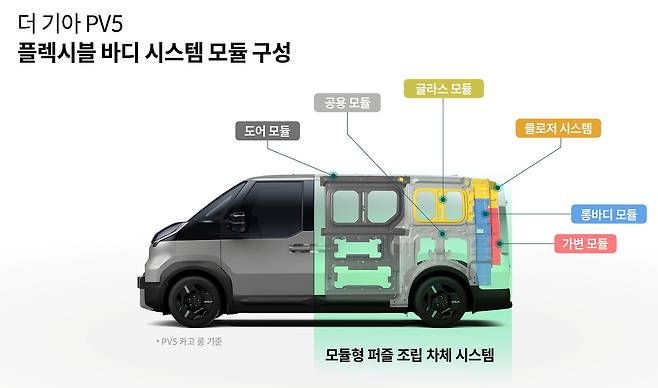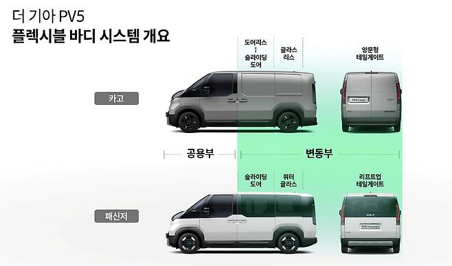 PV5는 전면부와 1열 구조가 전 모델 동일한 공용부로 운영되고, 1열 이후와 후면부는 변동부로 리어 오버행, 테일게이트, 쿼터 글라스, 루프 등의 차체 및 외장 부품을 모듈화해 선택적으로 조합할 수 있도록 설계됐다.