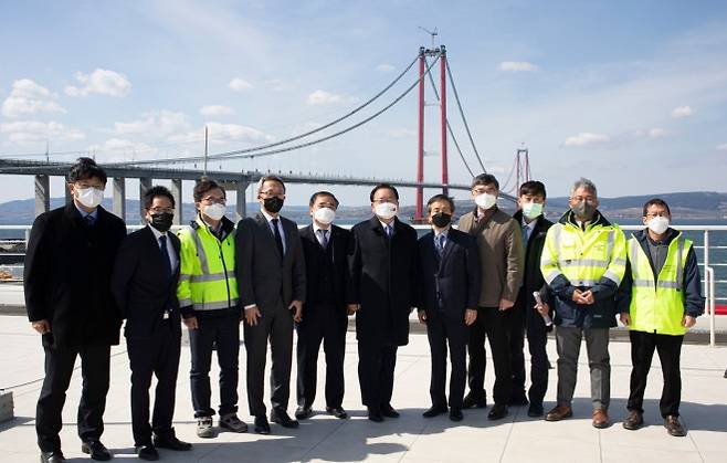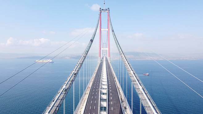 터키 다르다넬해협을 가로지르는 ‘차나칼레 1915 대교’는 개통 당시 주탑 간 거리 2023m, 총연장 3.5km대를 기록한 세계 최장 현수교로 공학 난도가 극한에 달한 프로젝트였다. 원청은 한국의 DL이앤씨와 SK에코플랜트가 터키 파트너와 구성한 컨소시엄으로, 설계·시공·운영까지 이어지는 투자개발형 방식으로 추진됐다. 한국 측은 입찰설계와 주탑 시공, 주케이블 가설, 거더 제작·운반·가설 등 현수교 핵심 공정을 총괄했고, 공기 단축과 무재해 기록으로 국제 교량업계의 주목을 받았다. 개통식에는 양국 정상급 인사가 참석했고, 한국 기업은 12년 운영 후 이관하는 구조를 확정하며 책임 범위를 분명히 했다.