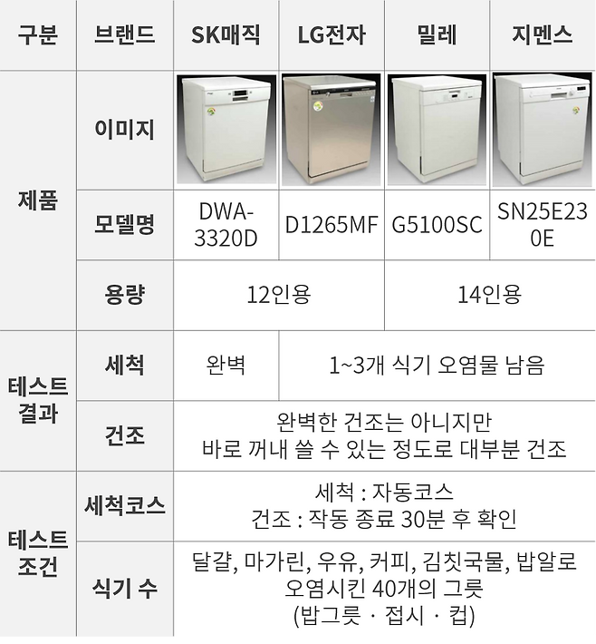 위 표는 한국 소비자원에서 2012년에 진행한 식기세척기 테스트 결과입니다. 현재 판매되지 않는 구 모델의 테스트 결과지만 참고용으로 충분히 활용할 수 있는 자료입니다.