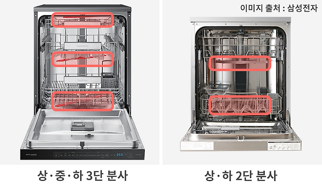 8~12인용 기준으로 생각했을 때에는, 상/중/하 3개의 물분사 장치를 갖춘 제품이 가장 좋습니다. 최근 출시되는 대부분 제품이 상/중/하 구성이기는 하지만 간혹 2개의 물분사 장치만 탑재된 제품도 있으니, 확인 후 구매를 권장합니다.